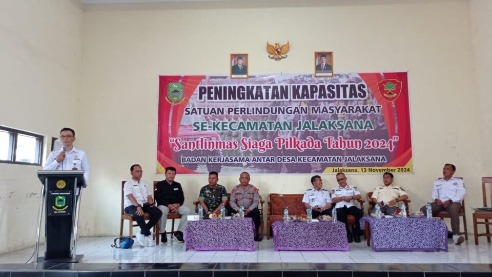 KUNINGAN – Ratusan anggota Perlindungan Masyarakat (Linmas) se- Kecamatan Jalaksana yang ditugaskan mengamankan Tempat Pemungutan Suara (TPS) pada Pilkada Serentak 2024 mendapatkan pembekalan khusus. Pembekalan ini bertujuan untuk mendukung kelancaran dan keamanan penyelenggaraan Pilkada Kuningan 27 November mendatang di balai desa Sembawa, Rabu (13/11).