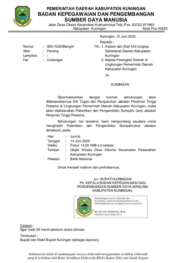 Surat undangan resmi kegiatan ini ditandatangani langsung oleh Bupati Kuningan Dr. H. Dian Rachmat Yanuar, M.Si. sebagai pejabat terkait dalam pelaksanaan acara.