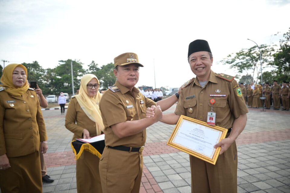 Atas pencapaian tersebut, Bupati Kuningan Dr. H. Dian Rachmat Yanuar, M.Si., secara langsung menyerahkan penghargaan kepada Kepala Disdukcapil, Drs. Yudi Nugraha, M.Pd., pada apel pagi di Halaman Setda Kuningan, Kompleks KIC, Senin (4/8).
