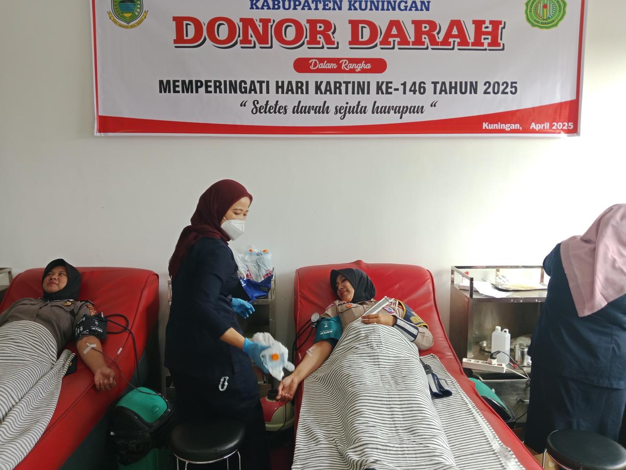 KUNINGAN- Semangat Kartini mengalir dalam aksi kemanusiaan puluhan Polwan Polres Kuningan yang antusias mengikuti kegiatan donor darah di markas Palang Merah Indonesia (PMI) Kabupaten Kuningan, Senin pagi. Kegiatan ini menjadi bagian dari rangkaian peringatan Hari Kartini yang digelar oleh Gabungan Organisasi Wanita (GOW) Kabupaten Kuningan.