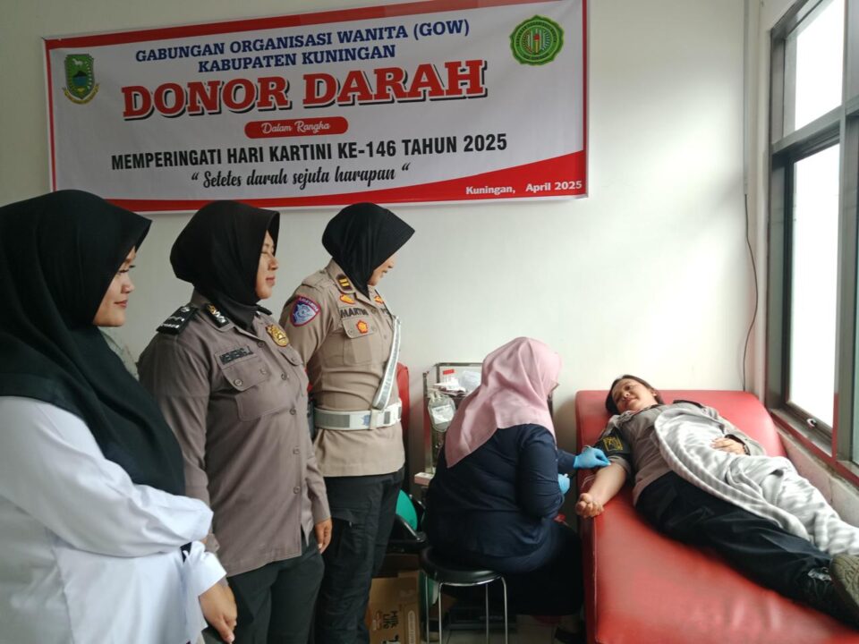 KUNINGAN- Semangat Kartini mengalir dalam aksi kemanusiaan puluhan Polwan Polres Kuningan yang antusias mengikuti kegiatan donor darah di markas Palang Merah Indonesia (PMI) Kabupaten Kuningan, Senin pagi. Kegiatan ini menjadi bagian dari rangkaian peringatan Hari Kartini yang digelar oleh Gabungan Organisasi Wanita (GOW) Kabupaten Kuningan.