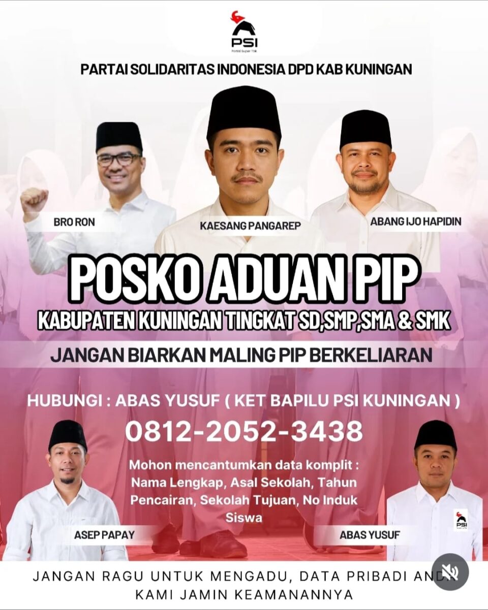 KUNINGAN – Dewan Pimpinan Daerah (DPD) Partai Solidaritas Indonesia (PSI) Kabupaten Kuningan resmi meluncurkan Posko Aduan Program Indonesia Pintar (PIP) sebagai bentuk komitmen mengawal transparansi dan penyaluran bantuan pendidikan yang tepat sasaran. Posko ini terbuka bagi seluruh pelajar jenjang SD, SMP, SMA, dan SMK di Kuningan yang merasa hak mereka atas dana PIP tidak diterima sebagaimana mestinya.